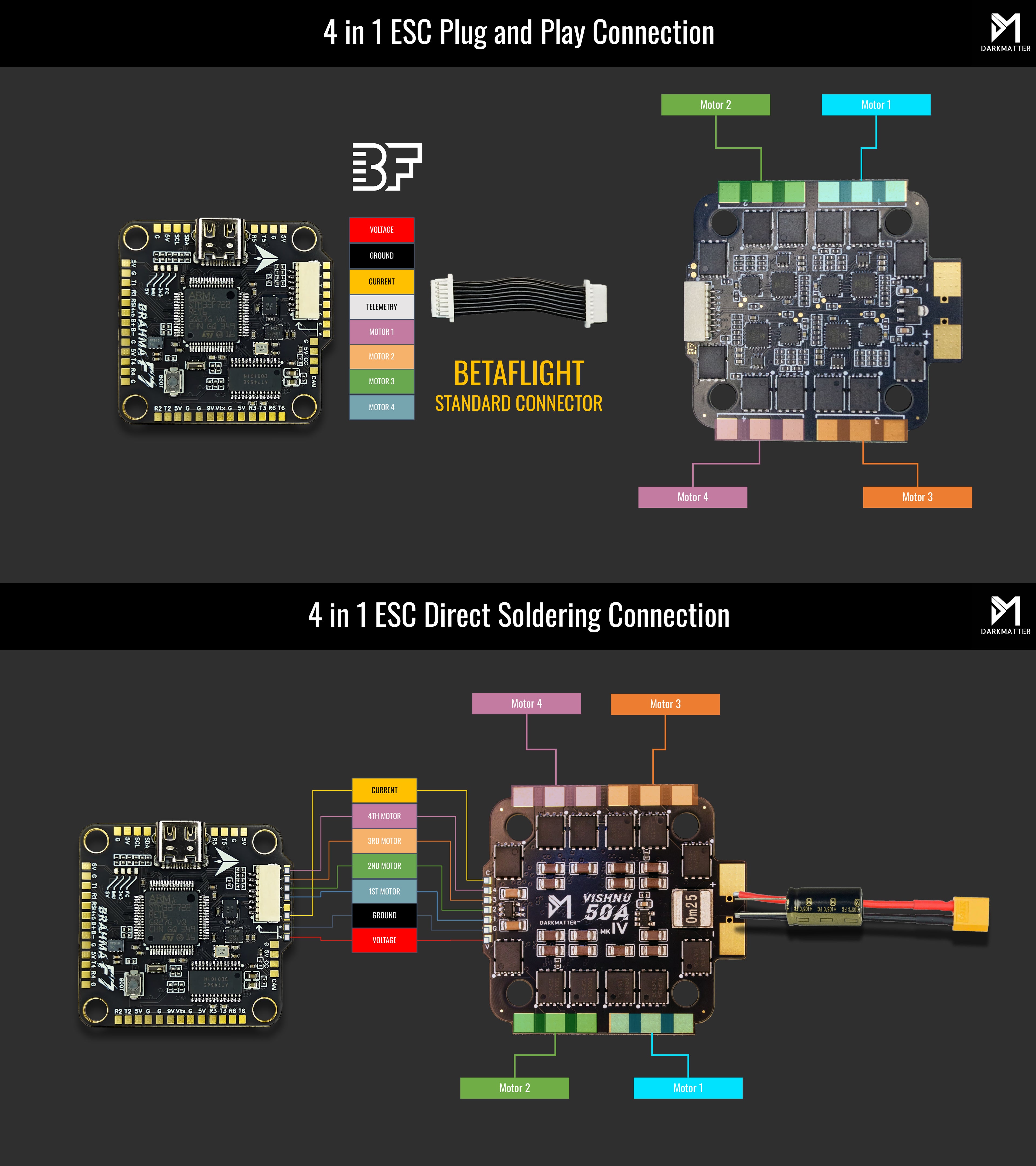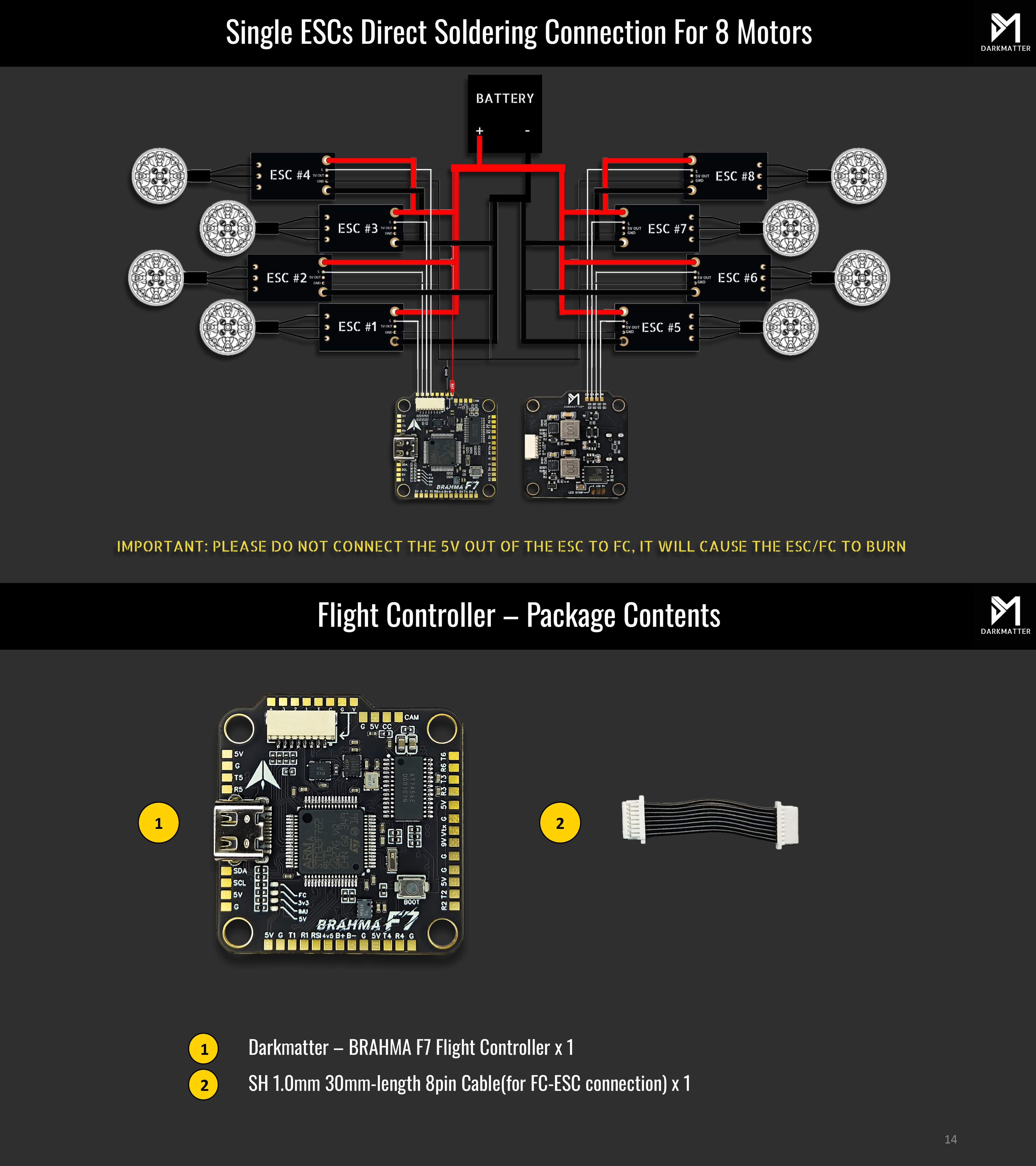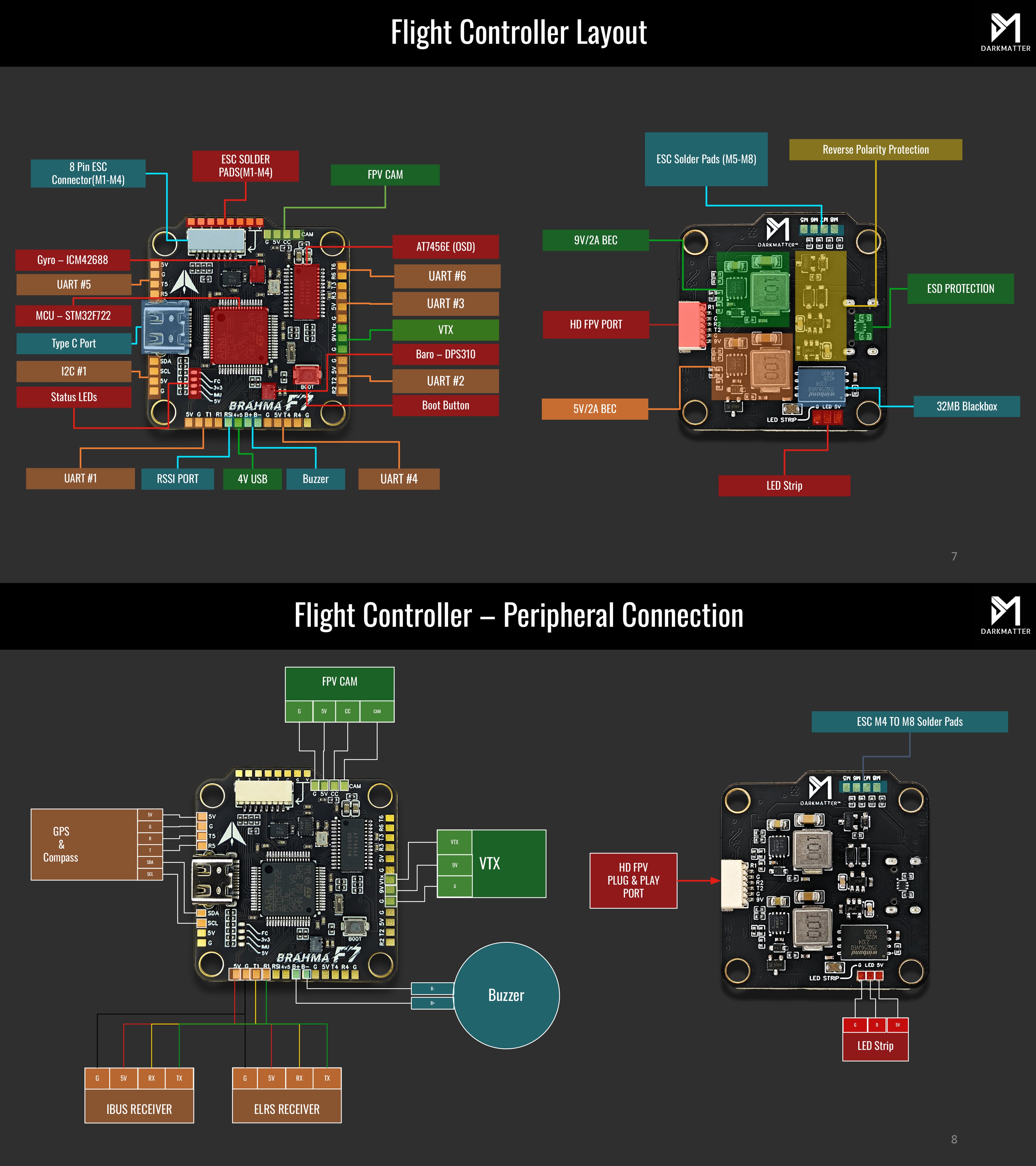 With motor pads M1–M8, the FC supports quad, hex, and X8 powertrains — perfect for cinematic rigs, long-range explorers, and thrust-heavy builds.